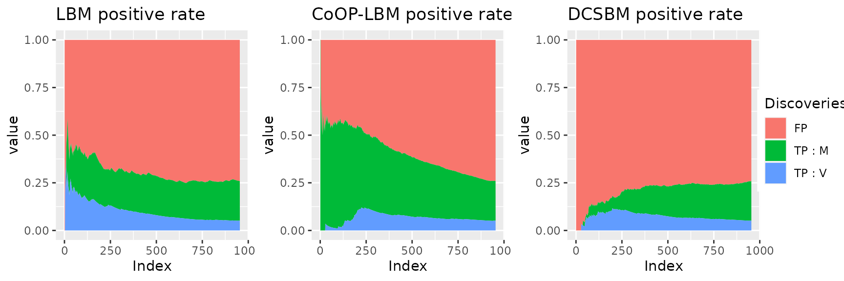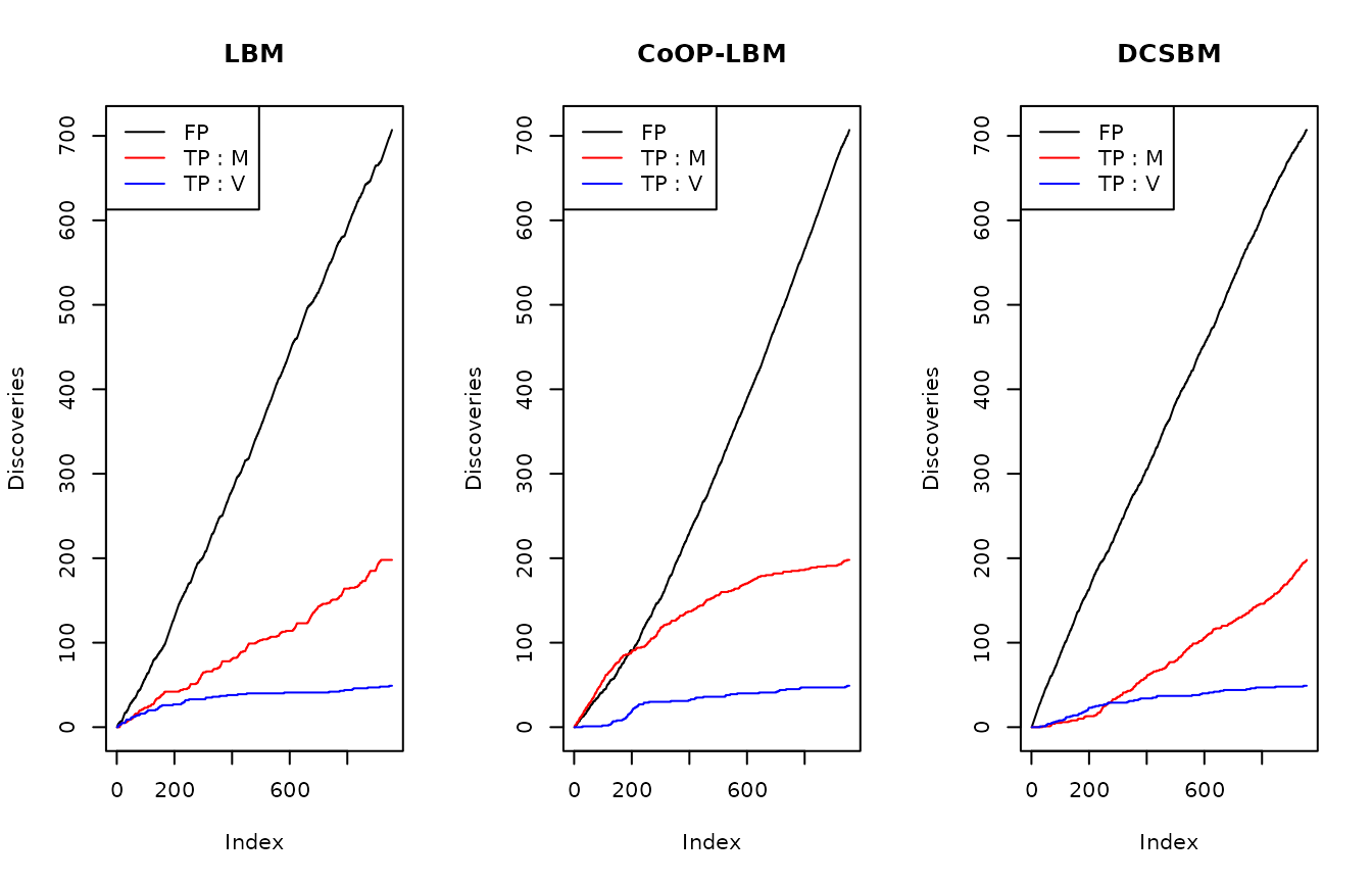 We fit each method (LBM, CoOP-LBM and DCSBM), and estimate a probability of missing value \(\hat{p}_{i,j}\) where \(U_{obs}=0\). We order these probabilities in decreasing in order, which would be the order of discoveries, and then we consider the following values :