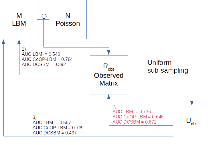 - As we can see, on simulated data the CoOP-LBM can retrieve the missing interaction of M using the observed matrix compared to the LBM and the DCSBM.